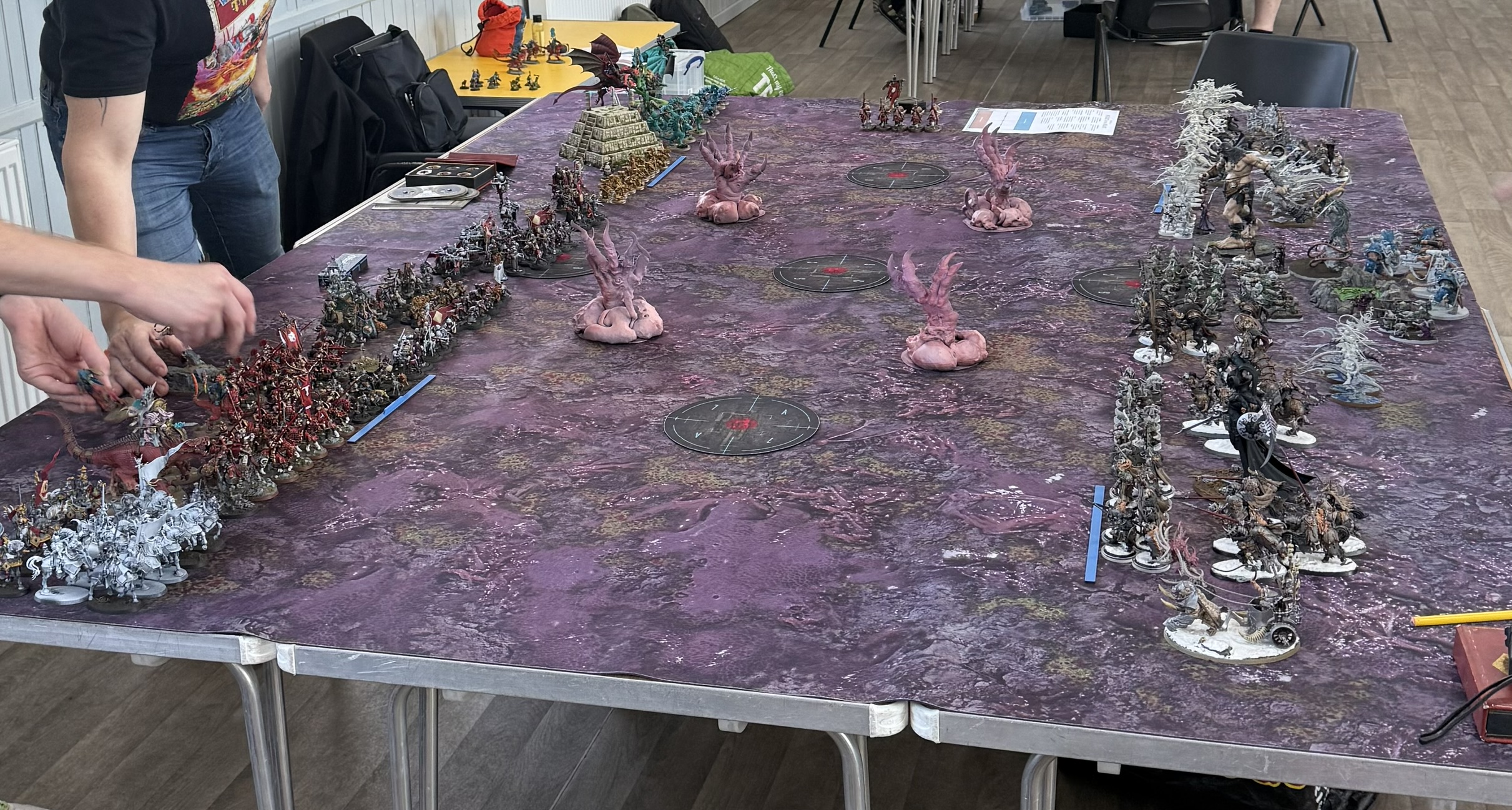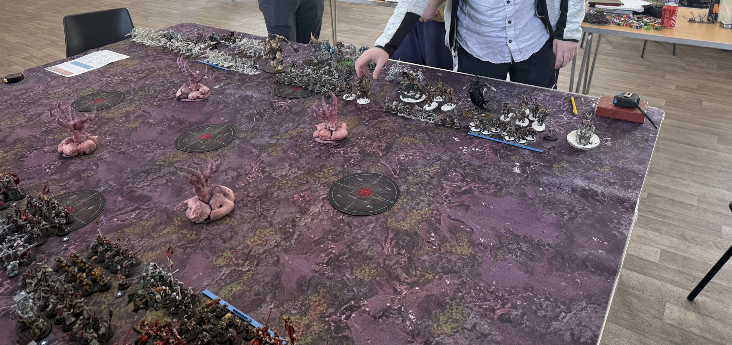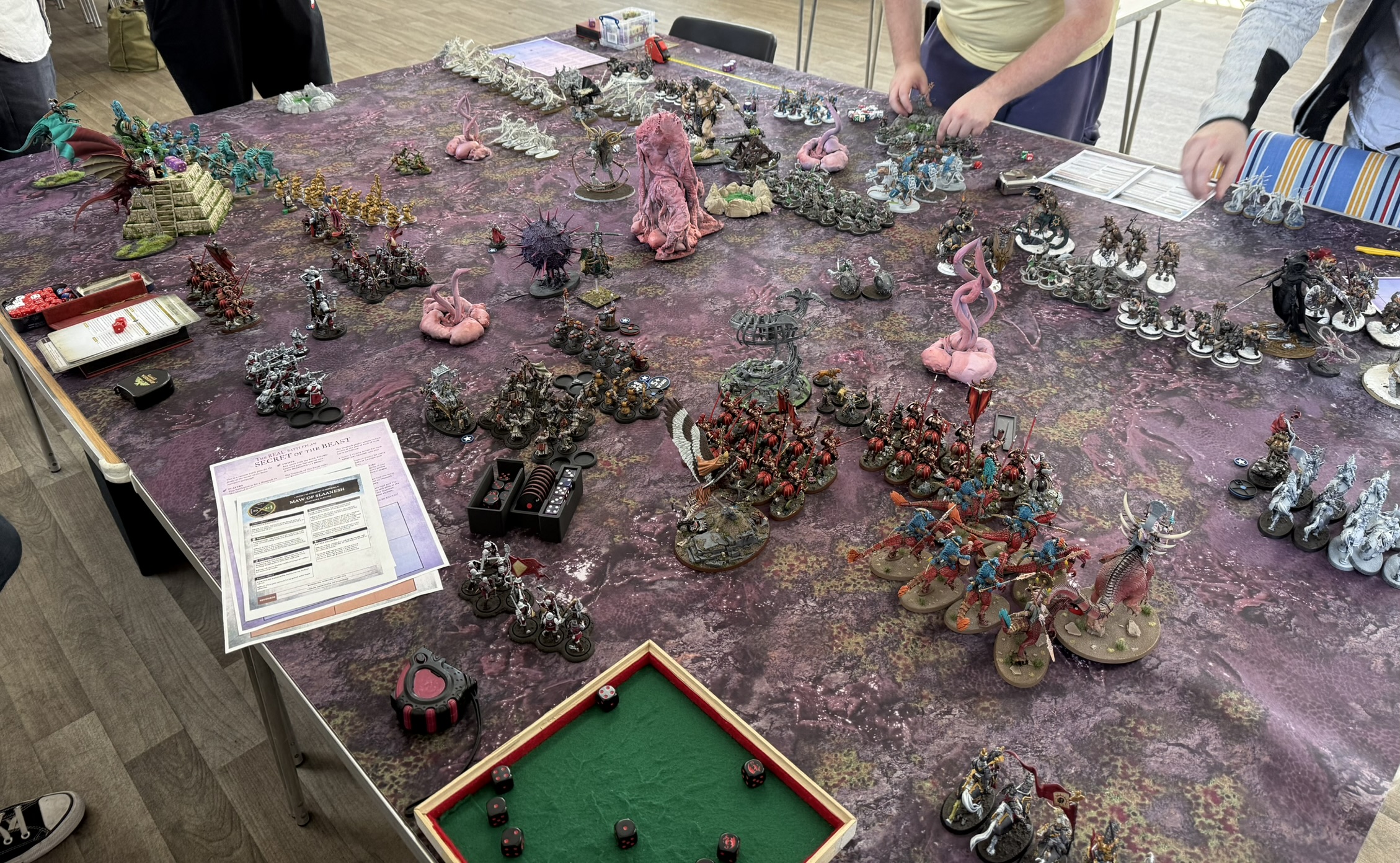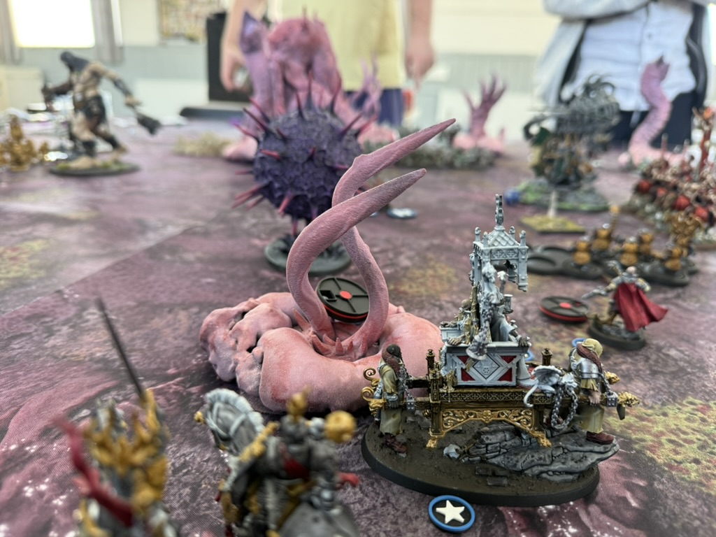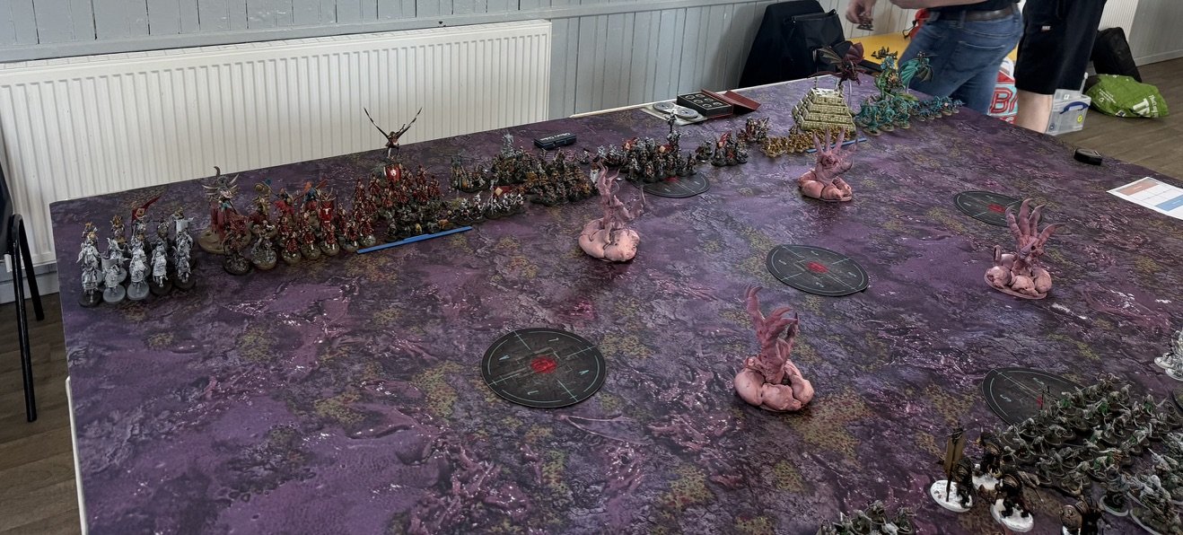 Midway through the game, the mission took a dramatic twist. The central objective transformed into The Maw of Slaanesh, while the surrounding points became Tentacles of the Beast. From Turn 2, a full Slaanesh army entered the table — hostile to everyone.